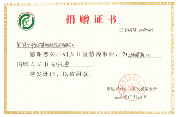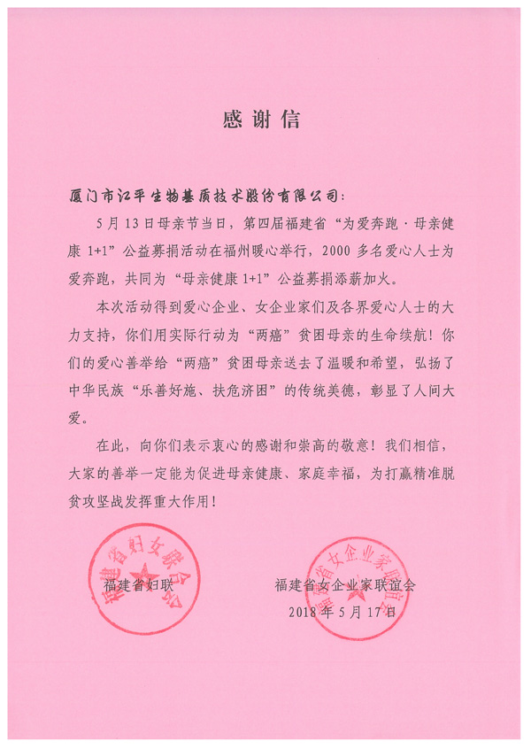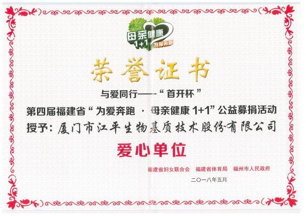 江平生物夏江平董事長(cháng)不僅在工作上兢兢業(yè)業(yè),更是積極參與社會(huì )活動(dòng),在2018年2月被廈門(mén)市婦女聯(lián)合會(huì )評為“2016-2017年度三八紅旗手”。本次“為愛(ài)奔跑·母親健康1+1’”公益募捐活動(dòng)中,她積極響應福建省婦聯(lián)的號召,配合福建省婦聯(lián)的工作開(kāi)展,以公司名義捐款,用實(shí)際行動(dòng),為“兩癌”貧困母親送去溫暖和希望,略盡綿薄之力。