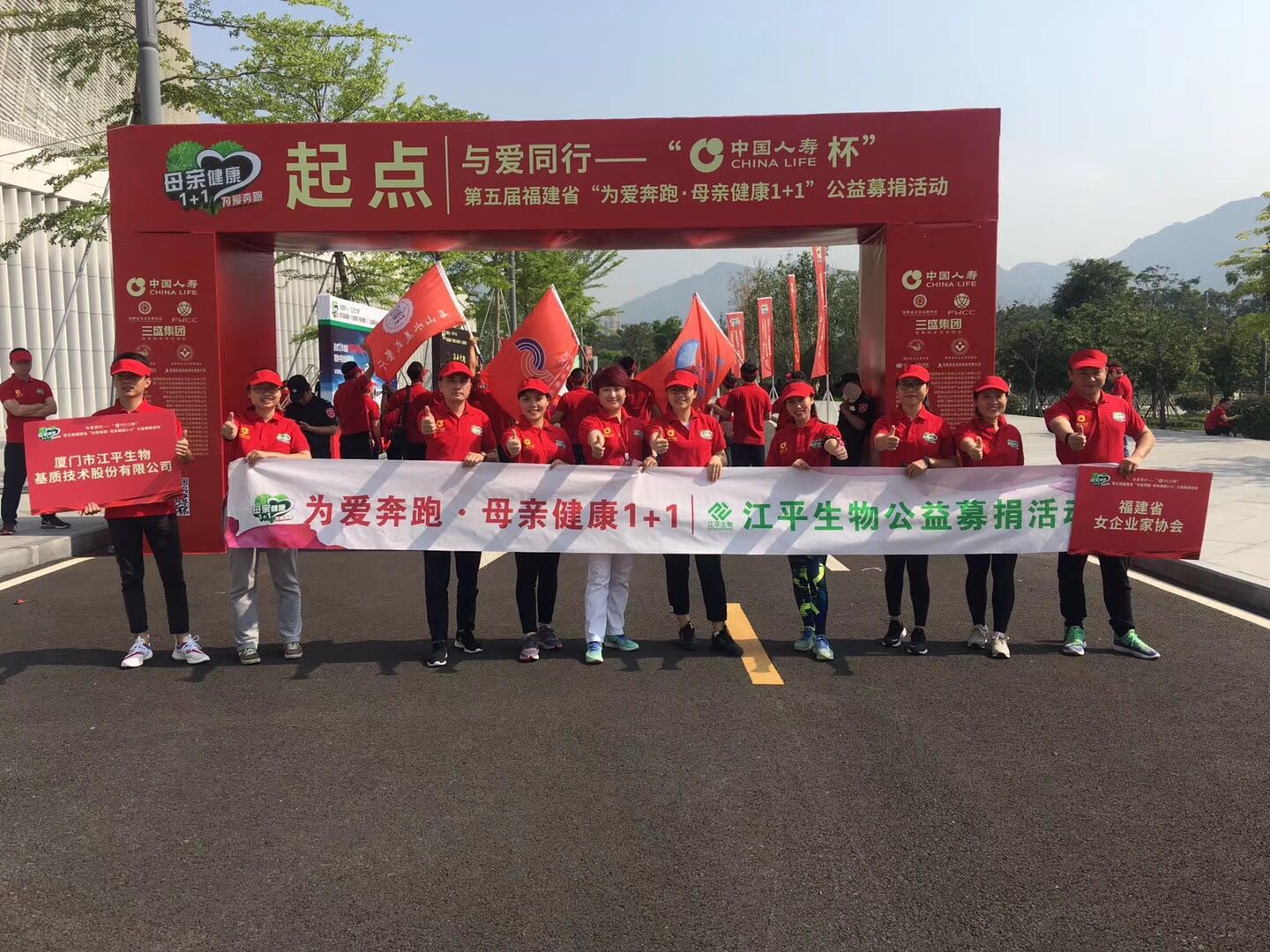 2019年5月12日,第五屆福建省“為愛(ài)奔跑·母親健康1+1”公益募捐活動(dòng)于福州海峽文化藝術(shù)中心舉行,廈門(mén)市江平生物基質(zhì)技術(shù)股份有限公司總裁夏江平女士作為福建省女企業(yè)家一員帶領(lǐng)江平生物公司數位員工為愛(ài)而跑,并捧回了“愛(ài)心企業(yè)”榮譽(yù)證書(shū)。
