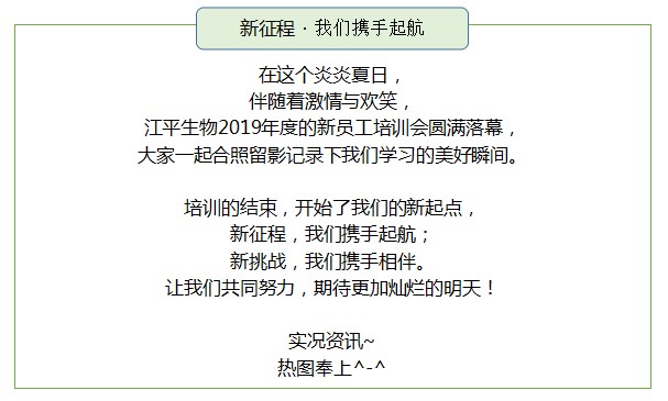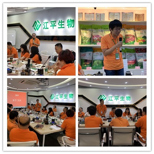 2019年6月22日,江平生物舉行了2019年新員工培訓會(huì )。會(huì )上,江平生物董事長(cháng)夏江平女士以及公司兩位副總裁鐘曉輝、吳凱為小伙伴們帶來(lái)了滿(mǎn)是“干貨”的分享,整個(gè)過(guò)程充滿(mǎn)歡樂(lè )與激情。