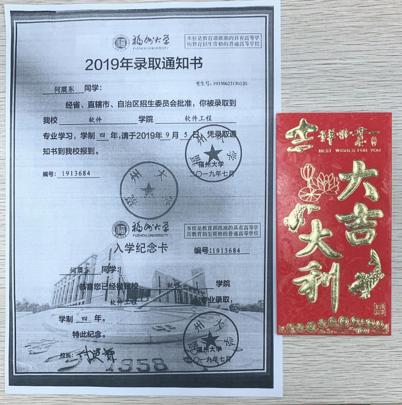 金秋八月,一批批莘莘學(xué)子即將邁進(jìn)大學(xué),開(kāi)啟人生逐夢(mèng)的新征程。今年,江平生物漳州工廠(chǎng)同事何亞藝之子何震東在經(jīng)歷了“千軍萬(wàn)馬過(guò)獨木”的高考之后如愿考上福州大學(xué)軟件學(xué)院。