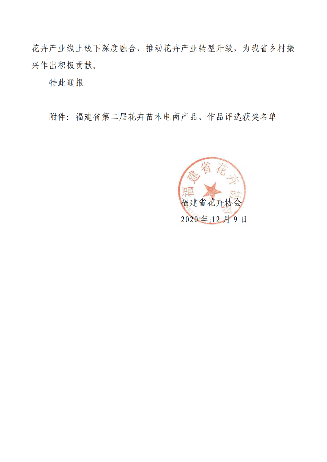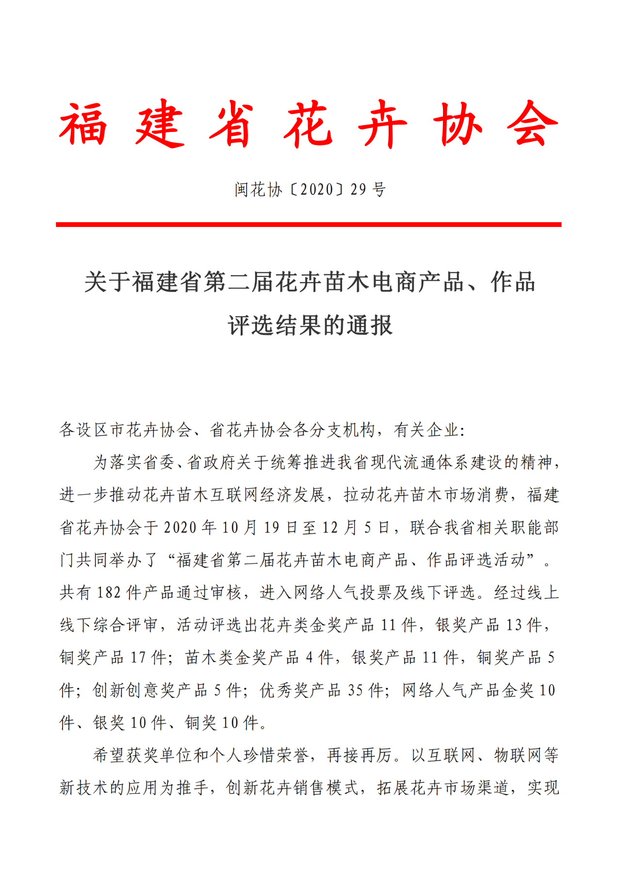 為落實(shí)省委、省政府關(guān)于統籌推進(jìn)福建省現代流通休系建設的精神,進(jìn)一步推動(dòng)花卉苗木互聯(lián)網(wǎng)經(jīng)濟發(fā)展,拉動(dòng)花卉苗木市場(chǎng)消費,福建省花卉協(xié)會(huì )于2020年10月19日至12月5日,聯(lián)合福建省相關(guān)職能部門(mén)共同舉辦了“福建省第二屆花卉苗木電商產(chǎn)品、作品評選活動(dòng)”。