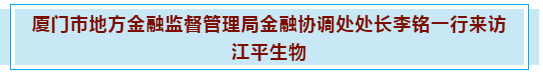 1月21日下午,廈門(mén)市地方金融監督管理局金融協(xié)調處李銘處長(cháng)、廈門(mén)信昇達物聯(lián)科技股份有限公司周賢凱副董事長(cháng)一行光臨江平生物進(jìn)行參觀(guān)交流。我司董事長(cháng)夏江平、副總裁吳凱等公司高管熱情接待。