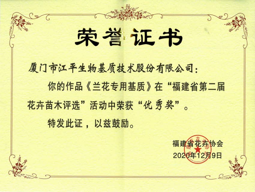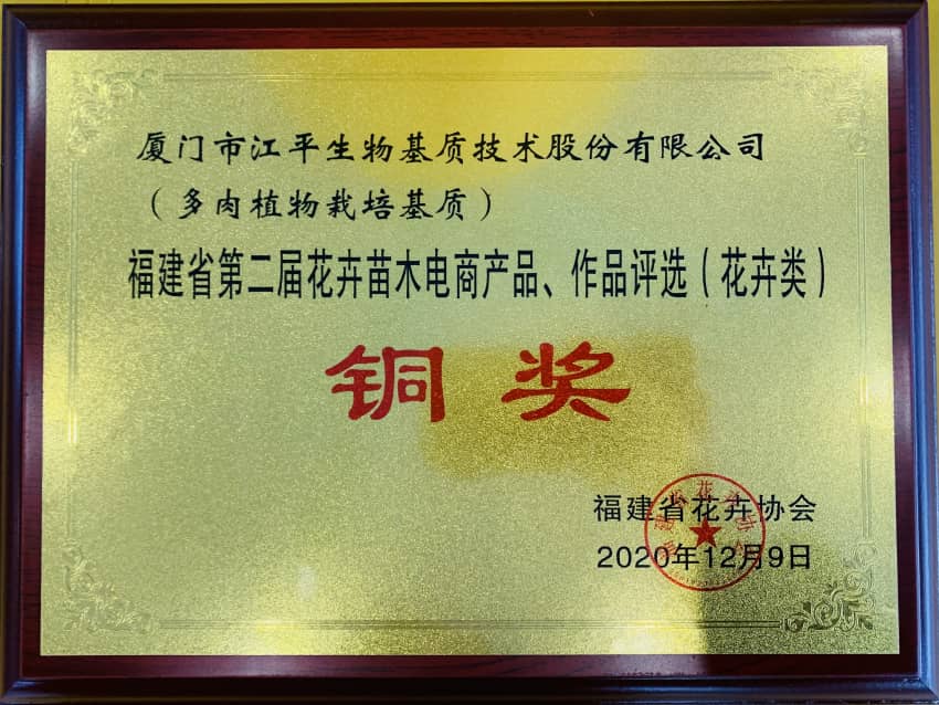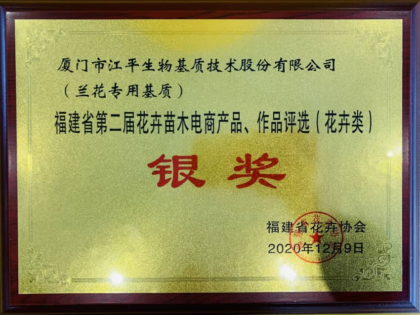 3月20日,廈門(mén)市江平生物基質(zhì)技術(shù)股份有限公司現身福建省第二屆花卉苗木電商產(chǎn)品、作品評選頒獎典禮!公司基質(zhì)產(chǎn)品“蘭花專(zhuān)用基質(zhì)”、“多肉植物栽培基質(zhì)”分別榮獲“福建省第二屆花卉苗木電商產(chǎn)品、作品評選活動(dòng)”之花卉類(lèi)銀獎、銅獎!其中,“蘭花專(zhuān)用基質(zhì)”還在本次評選活動(dòng)中榮獲“優(yōu)秀獎”,可喜可賀!