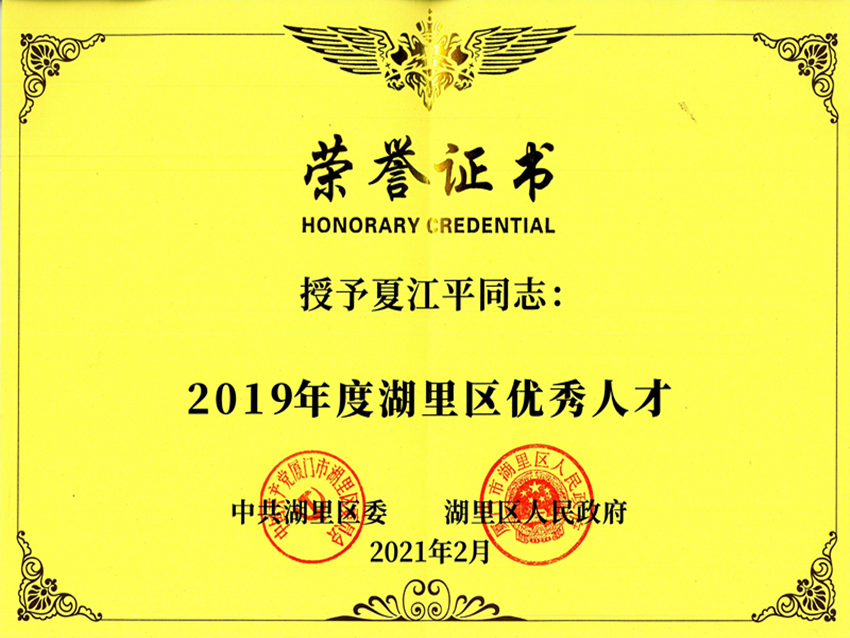 喜訊接踵而來(lái),繼榮獲福建省女企業(yè)家協(xié)會(huì )頒發(fā)的2020年度“開(kāi)拓創(chuàng  )新卓越獎”,我司夏江平董事長(cháng)再獲“2019年度湖里區優(yōu)秀人才”榮譽(yù)稱(chēng)號!