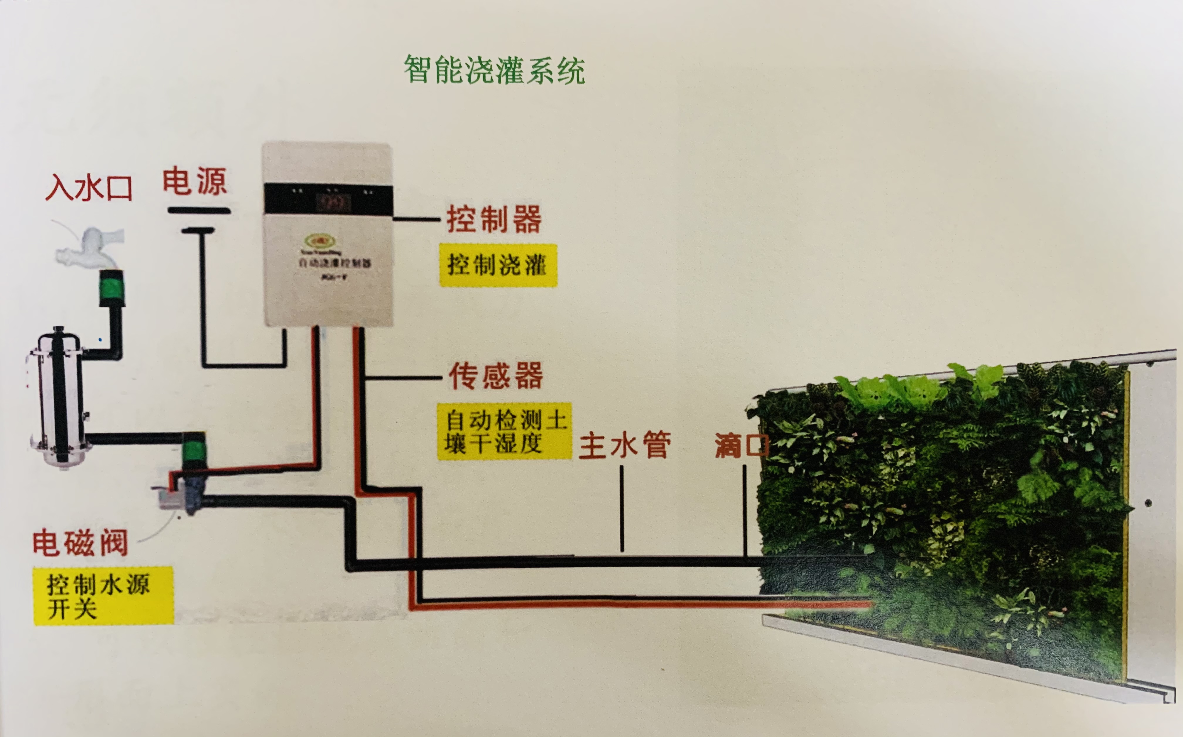 澆灌技術(shù)方面:智能平面灌溉(平面滲透式),從滴灌管滴出的水被附在防水層上的納米蓄水毯吸收并均勻滲透至種植袋中的種植缽內,再滲入泥土和植物根部,這樣澆灌均勻,避免了因滴頭經(jīng)常堵塞而帶來(lái)的植物死亡問(wèn)題。另外,在墻面覆蓋了一層防水阻根膜,既防止墻面滲水,也阻止根破壞墻面。