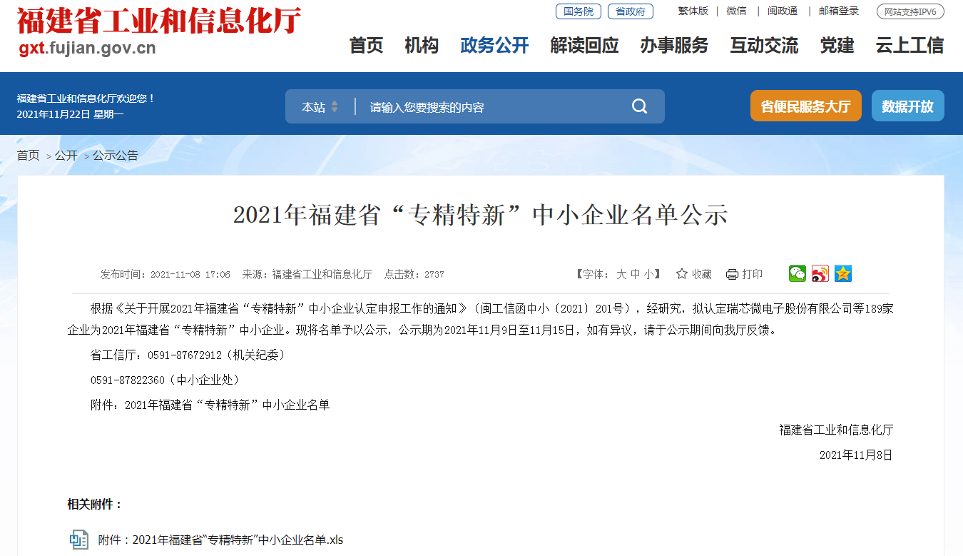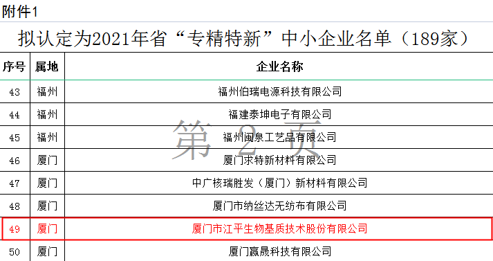近日,福建省工業(yè)和信息化廳發(fā)布2021年福建省“專(zhuān)精特新”中小企業(yè)公示名單,全省共有189家企業(yè)入圍,廈門(mén)市江平生物基質(zhì)技術(shù)股份有限公司喜上榜單!