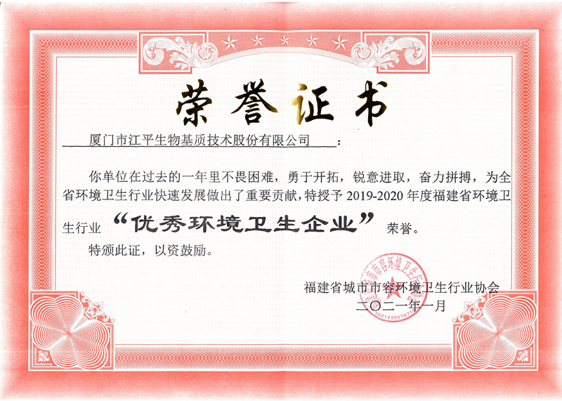 ?2019-2020年度福建省環(huán)境衛生行業(yè)“優(yōu)秀環(huán)境衛生企業(yè)”