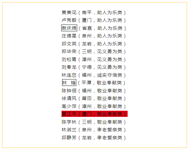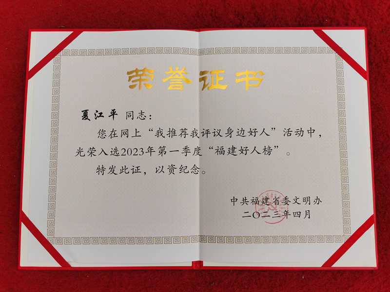 為深入學(xué)習宣傳貫徹黨的二十大精神,貫徹落實(shí)習近平總書(shū)記對道德模范重要指示精神和給“中國好人”的重要回信精神,宣傳展示全省身邊好人先進(jìn)事跡,推動(dòng)形成學(xué)習典型、崇尚模范、爭當好人的良好社會(huì )風(fēng)尚,2023年4月19日,“德耀八閩 文明有?!?023年第一季度“福建好人榜”發(fā)布儀式暨福州市道德模范身邊好人故事匯現場(chǎng)交流活動(dòng)在福州市隆重舉行。我司董事長(cháng)夏江平榮登2023年第一季度“福建好人榜”上榜人物(敬業(yè)奉獻類(lèi))并赴榕接受表彰。