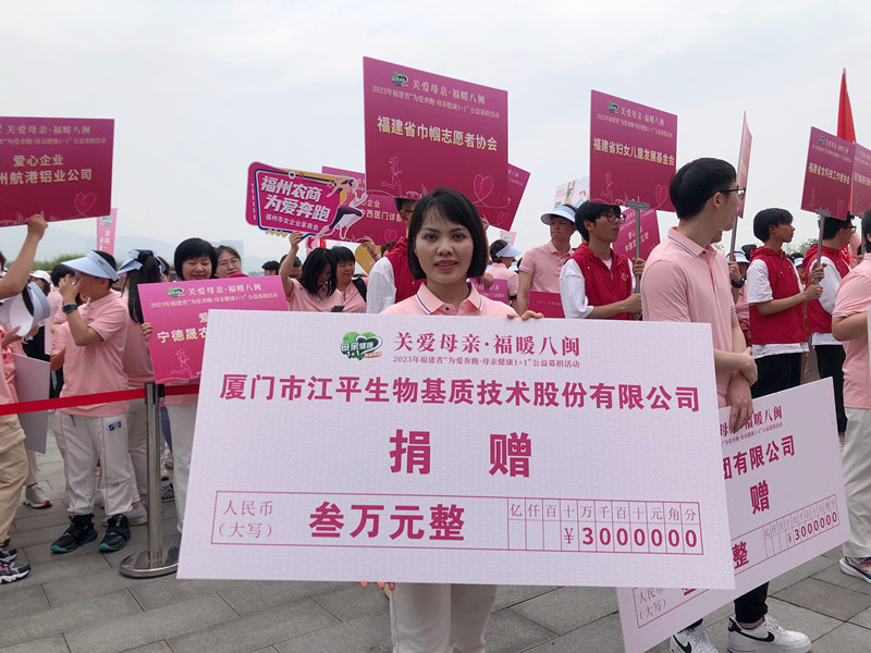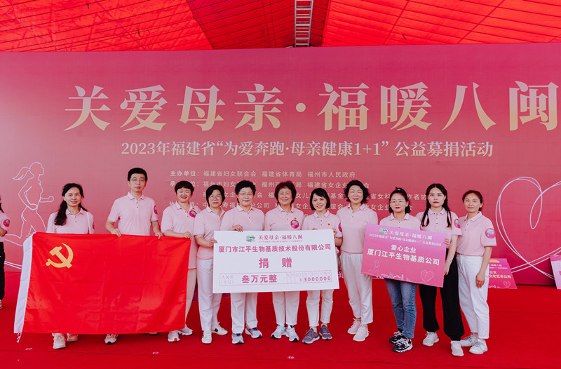 今日母親節,2023年福建省“為愛(ài)奔跑·母親健康1+1”活動(dòng)在海峽文化藝術(shù)中心順利舉行。作為本次募捐活動(dòng)愛(ài)心單位,江平生物為愛(ài)奔跑公益小分隊帶著(zhù)夏江平董事長(cháng)的囑托與祝福,代表公司同全省各級婦聯(lián)組織、女企業(yè)家和社會(huì )的各界愛(ài)心人士一起,繼續守護“兩癌”貧困母親和“頂梁柱”母親,暖心開(kāi)跑、傳遞溫暖!