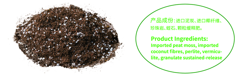 ● This product is mainly made from imported peat and coconut fibres which are mixed in scientific proportion. It has high gas permeability and great performance of preserving moisture and fertility. Thus, it creates a healthy rhizosphere environment for growth of root systems of plants.