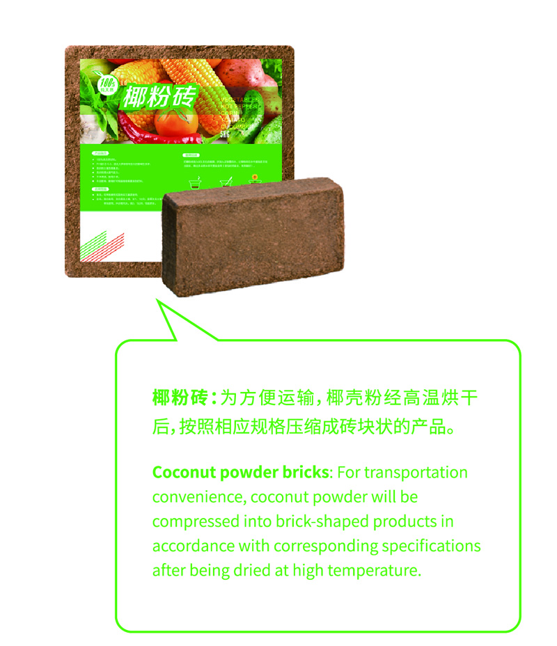 As a good and natural plant cultivation matrix material, coconut powder is widely used in home gardening, forestry, the seedling growing, cutting and planting of fruit trees, vegetables and flowering plants, soil improvement and other areas.