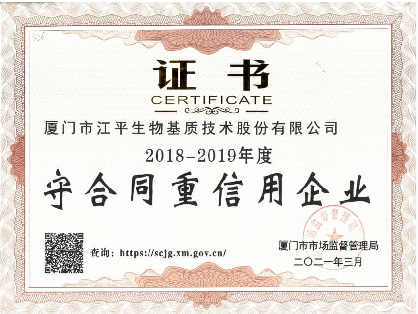 喜訊|江平生物榮獲“2018-2019年度守合同重信用企業(yè)”稱(chēng)號!