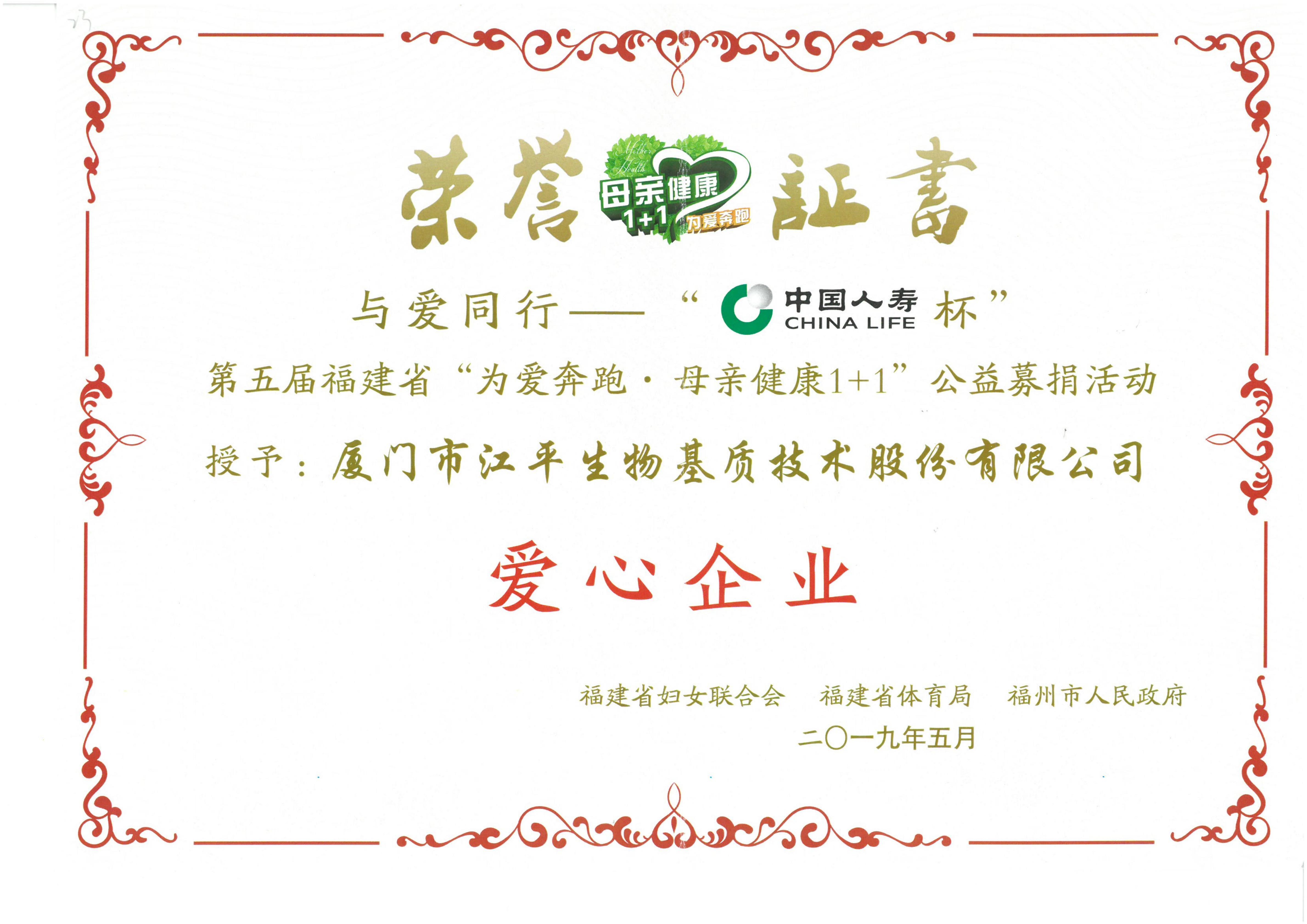 2019年5月12日,第五屆福建省“為愛(ài)奔跑?母親健康1+1”公益募捐活動(dòng)于福州海峽文化藝術(shù)中心舉行,廈門(mén)市江平生物基質(zhì)技術(shù)股份有限公司總裁夏江平女士作為福建省女企業(yè)家一員帶領(lǐng)江平生物公司數位員工為愛(ài)而跑,并捧回了“愛(ài)心企業(yè)”榮譽(yù)證書(shū)。
